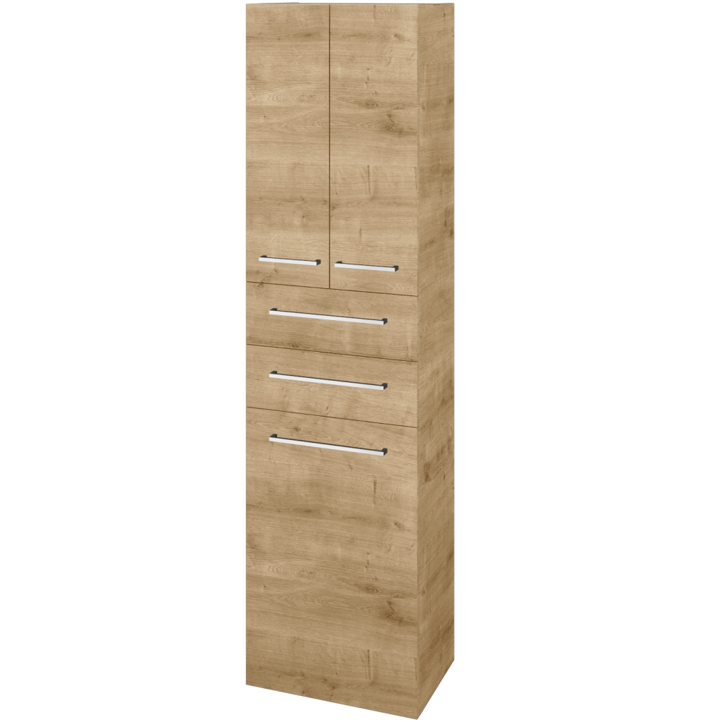 Maximum úložného prostoru nabízí doplňková skříň DOS SVD3Z2K 50, která je díky svému řešení velmi praktická, univerzální a vhodná do středně nebo větších koupelen.  Parametry skříně Skříň DOS SVD3Z2K 50 je konstruována jako závěsná. Díky své výšce - 198,2 cm - vám nabídne opravdu velké množství úložného místa v několika částech. Horní část je dvoudveřová se 2 skleněnými a nastavitelnými policemi. Od spodní části s výklopným košem je oddělena dvojicí praktických zásuvek. Jak dvířka, tak i zásuvky, jsou uloženy na kování značky Hettich s jemným dovíráním a otevírají se pomoci úchytky. Vybírat můžete z pěti typů: T01 - matná oblá úchytka T02 - ocelová kulatá úchytka T03 - chromová hranatá úchytka T04 - chromová úchytka s lesklým povrchem T06 - černá mat Povrchové úpravy Skříň vyrábíme v celé řadě dekorů, dřevodekorů a laků v provedení lesk/mat. Samozřejmostí je také úprava v provedení Individual dle vzorníku RAL/NCS. Sladění s ostatními skříněmi ve vaší koupelně nebylo nikdy jednodušší. Přednosti skříňky: kování značky Hettich dodáváme s celoživotní zárukou. součástí skříně je výklopný koš na prádlo. úložný prostor je díky výšce skříně - 198 mm - opravdu veliký.