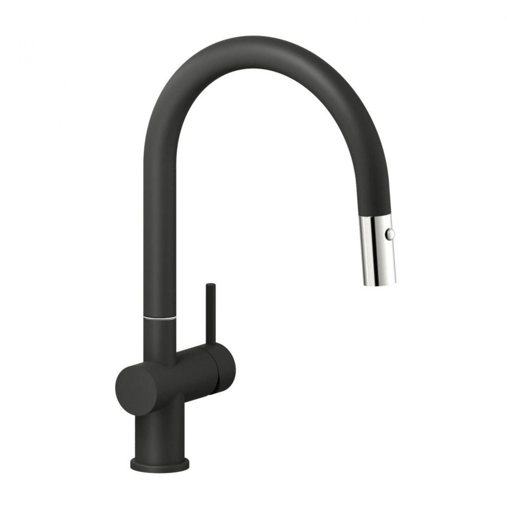Dřezová páková baterie, mosaz, povrch černý / chrom, s odnímatelnou sprchou Materiál: mosaz Povrchová úprava: černá / chrom Výsuvná sprcha Montáž: jednootvorová (průměr otvoru 35 mm) Výška baterie: 385 mm Délka výtoku: 227 mm Otočná o 360° Úhel otevření páky: 90° Flexibilní připojovací hadice
