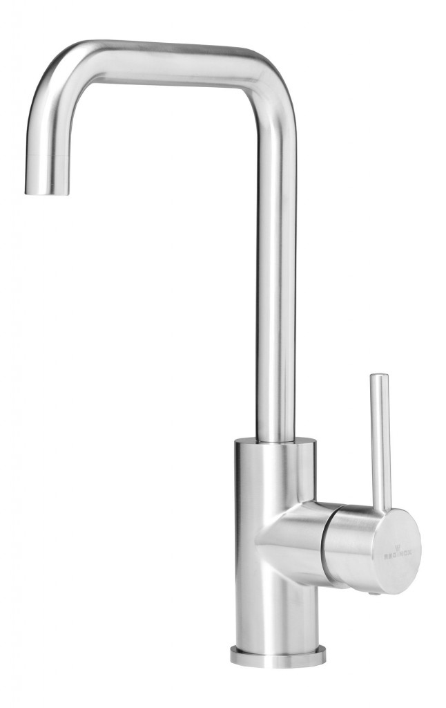 Dřezová páková baterie, nerez, povrch nerez Materiál: nerezová ocel 304 Povrchová úprava: nerez Montáž: jednootvorová (průměr otvoru 35 mm) Výška baterie: 338 mm Délka výtoku: 222 mm Otočná o 360° Úhel otevření páky: 90° Flexibilní připojovací hadice
