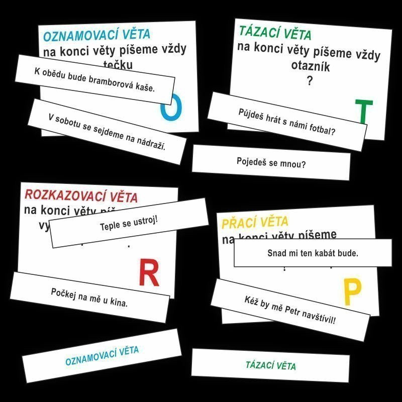 48 kartiček s větami ke třídění podle druhu vět.Součástí je i 1 sada podložek - Druhy vět - podložky.