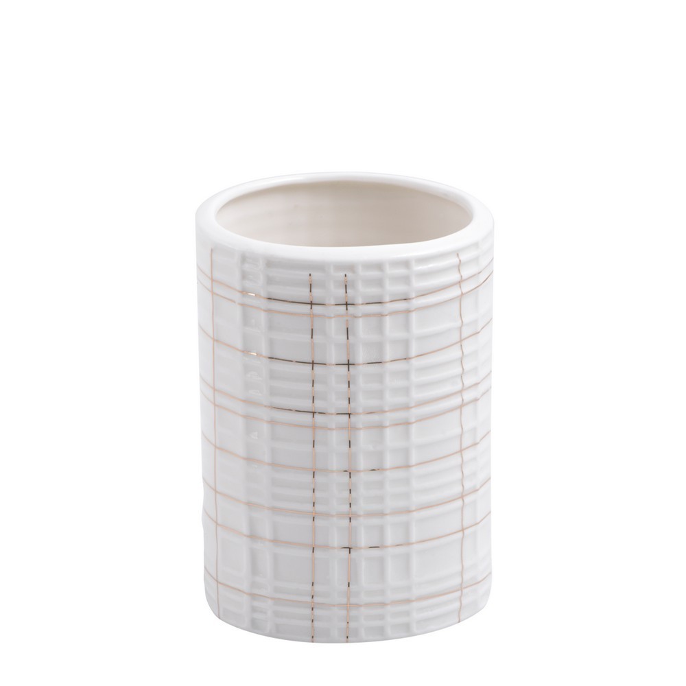 Hrnek ze série ALIZE. Je vyrobena z porcelánu krémové barvy s hnědou mřížkou.