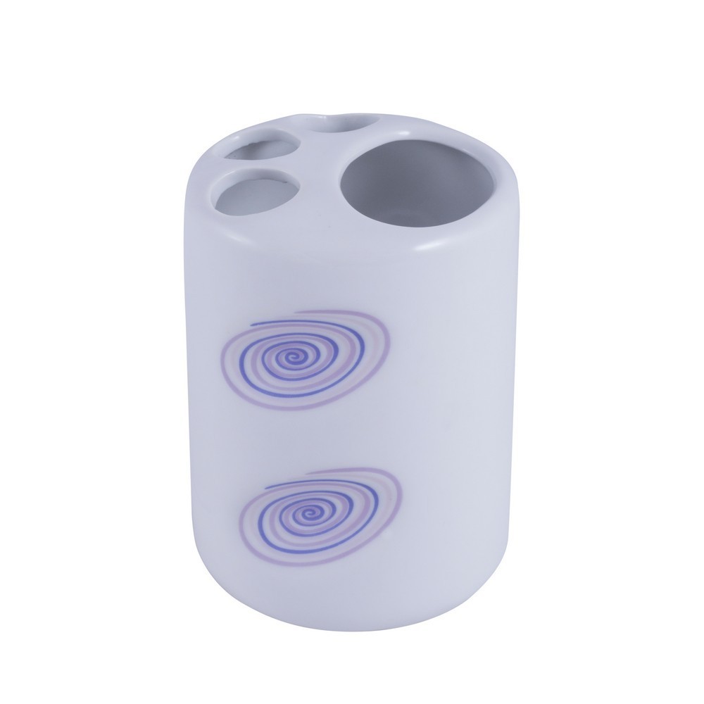 Kelímek na zubní kartáček řady FUMI. Jeho bílé pouzdro je zdobeno fialovými spirálami.