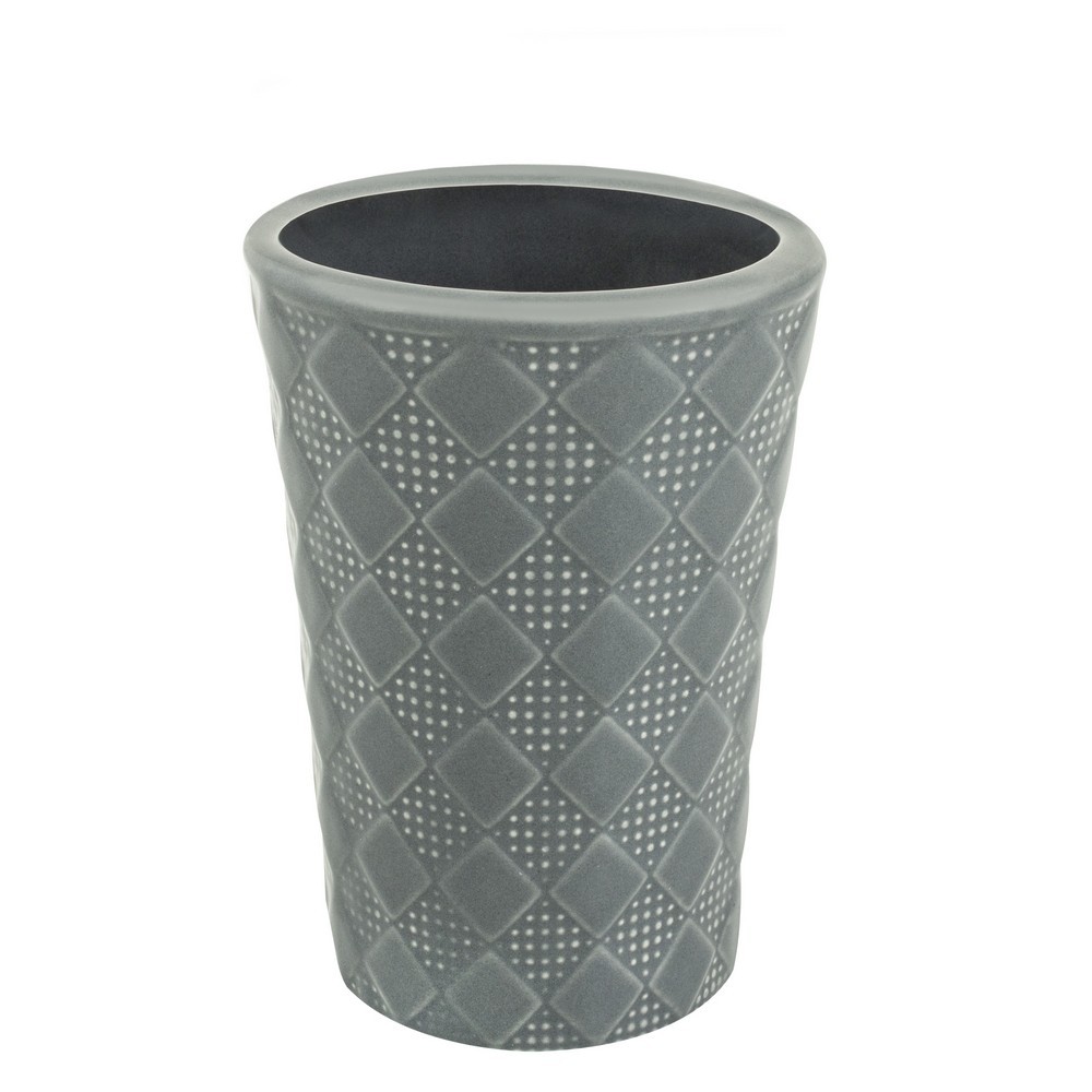 Kelímek na zubní kartáčky a zubní pastu ze série Karos. Koupelnová sestava Karos má patchwork texturu a neutrální šedou barvu, takže se bude dobře vyjímat v klasickém i moderním aranžmá.