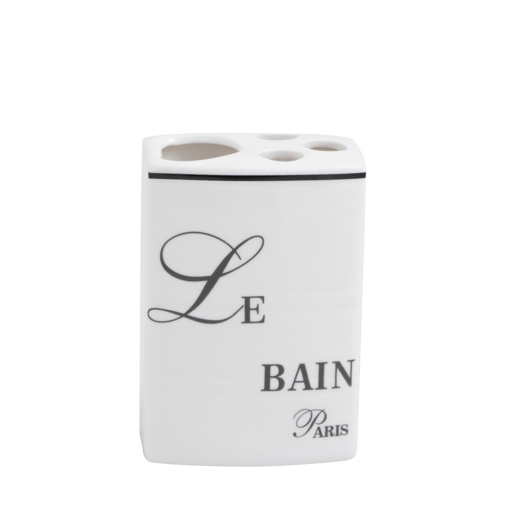 Kelímek na zubní kartáčky ze série PAULO, bílý s černými nápisy. Byl vyroben z porcelánu.
