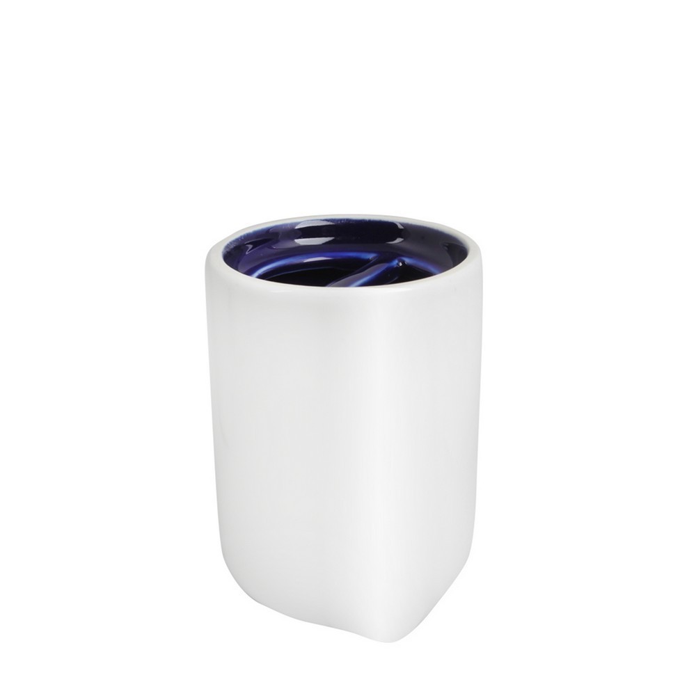 Moderní kameninový hrnek na zubní kartáčky ze série BRAWA. Vnější část pouzdra je bílá, zatímco vnitřní část je tmavě fialová.