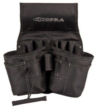 Popis: Pouzdro vyrobené z velmi odolného nylonu. 4 široké centrální kapsy na hřebíky a šrouby. 2 malé boční kapsy. Kroužek na držáky tkanin. Držák lepicí pásky. Spodní kapsy. Držák pera a šroubováku. Zesílené švy a nýty v oblastech zvláště vystavených dlouhodobému namáhání a roztržení.