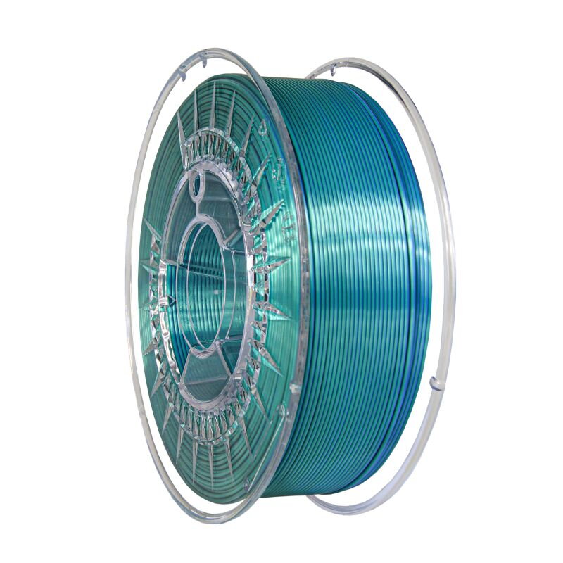 Dual SILK polského výrobce Devil Design je unikátní kombinace PLA a PETG, která pomáhá v nepřekonatelném lesku a zároveň vyzdvihuje tiskové vlastnosti obou materiálů této kombinace. Tisková struna je vakuově zabalena spolu s pohlcovačem vlhkosti a umístěna v kartonové krabici. V každém balení je vložen štítek s informací o doporučeném nastavení tiskových teplot. Průměr struny: 1, 75 mm. Výrobce garantuje tloušťku tiskové struny +/-0,05 mm. Barva: Cold Green -Blue (studeně zelená s modrou - podélně dvoubarevný filament) Upozornění: u lesklých filamentů dochází k jinému barevnému efektu při různém světlu jemuž je vystaven, to znamená, že odstín se může lišit od fotografie v závislosti na světle - denním nebo umělém a také nastavením displeje Vaší obrazovky. Výsledný výtisk je také mnohem lesklejší než struna samotná, která se může jevit matně.