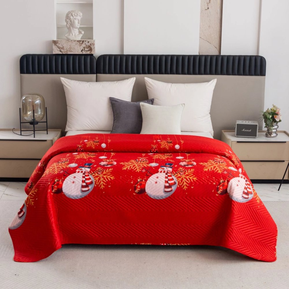 DumDekorace Červený prošívaný vánoční přehoz se sněhuláky - stylová zimní dekorace na postel Šířka: 170 cm | Délka: 210 cm