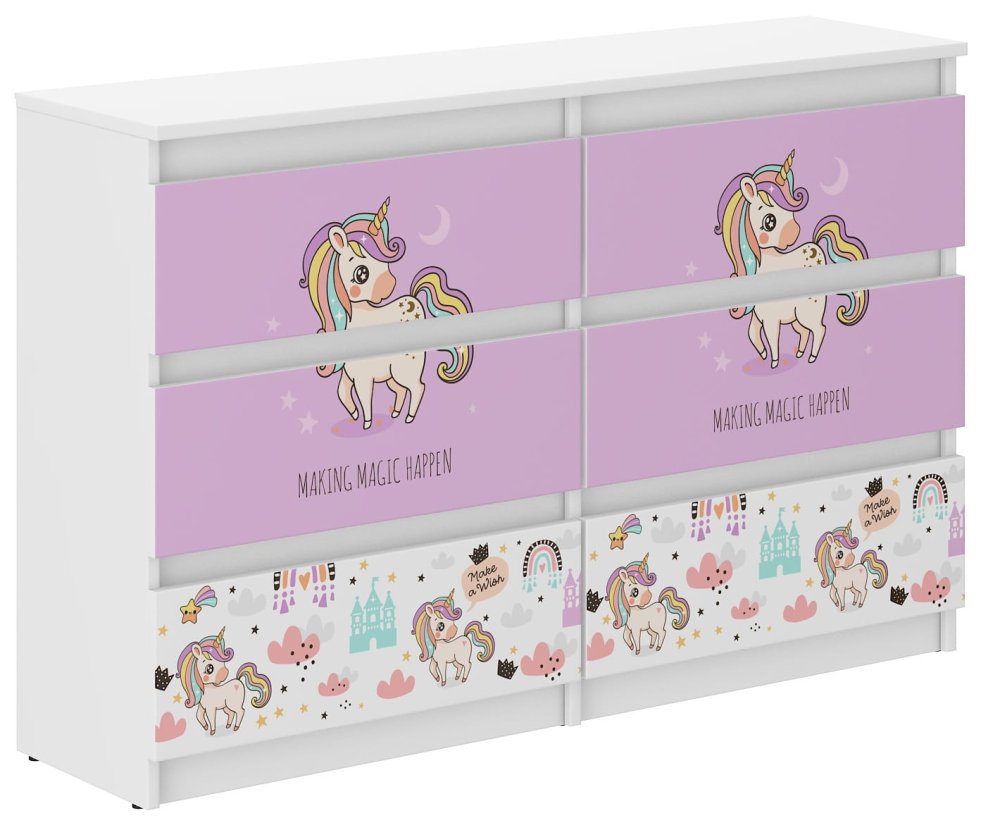 Přineste do dětského pokoje pohádkový nádech s našimi krásnými komodami pro chlapce i dívky! Pohádkové motivy, kvalitní materiál a zářivé barvy vytvoří v každém pokojíčku příjemnou atmosféru plnou fantazie. Naše dětské komody jsou navrženy s důrazem na bezpečnost, estetiku a dlouhodobou odolnost. Nejen krásná na pohled, ale také kvalitní a praktická! Komoda je vyrobena z odolné bílé dřevotřísky, povrchově upravené dýhou pro zvýšenou ochranu. Zásuvky jsou namontovány na vodítkách se zarážkami, které zabraňují jejich úplnému vysunutí, což zvyšuje bezpečnost při používání. Přední část komody s barevným potiskem je chráněna speciálním laminátem, který zaručuje dlouhou životnost barev bez vyblednutí či poškození. Čištění je snadné – stačí vlhký hadřík a voda. Specifikace: Materiál: laminová deska a PVC Počet zásuvek: 6 ks Barva: bílá + potisk Rozměry komody: 77 x 30 x 120 cm (výška x hloubka x šířka) Upozornění: Barvy se mohou mírně lišit v závislosti na nastavení monitoru.