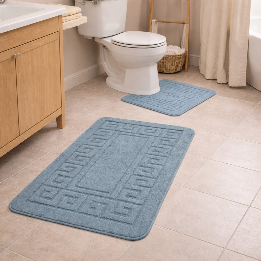 Tato stylová sada koupelnových předložek vnese do vaší koupelny pohodlí, bezpečí a osobitý design. Sada obsahuje dvě koupelnové předložky - větší před vanu nebo sprchový kout a menší před toaletu s praktickým výřezem. Protiskluzová spodní vrstva zajišťuje stabilitu na dlaždicích a zabraňuje klouzání, díky čemuž je každodenní používání bezpečnější a pohodlnější. Koupelnové předložky jsou vyrobeny z vysoce kvalitního polypropylenu, který je odolný vůči deformaci a opotřebení a zároveň příjemný na dotek. Měkký vlas o výšce přibližně 10 mm poskytuje pohodlí při každém kroku a pomáhá udržovat podlahu suchou. Praktickou výhodou je, že je lze prát v pračce na 30 °C, takže údržba je rychlá a snadná. Etnický vzor dodává koupelně útulnou atmosféru a stane se výrazným doplňkem moderního i klasického interiéru. Specifikace: Typ produktu: sada koupelnových předložek 2 ks Barva: perská modrá Materiál: 100% polypropylen Protiskluzová spodní vrstva: ano Lze prát v pračce: 30 °C Výška vlasu: cca 10 mm Gramáž: 1000 g/m² Použití: interiér Rozměry větší podložky: 50 × 80 cm Rozměry menšího prostírání: 40 × 50 cm Výřez pro toaletu: ano