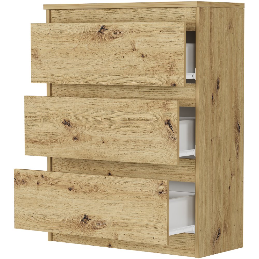 Kompaktní a elegantní komoda je ideálním doplňkem pro každého, kdo hledá kombinaci moderního designu a praktického využití. Díky svému nadčasovému designu se perfektně hodí do různých typů interiérů – ať už se jedná o obývací pokoj, pracovnu nebo studentský pokoj. Minimalistický design bez úchytek působí čistě a moderně, zatímco tři prostorné zásuvky nabízejí dostatek místa na oblečení, dokumenty nebo každodenní nezbytnosti. Komoda je vyrobena z vysoce kvalitní laminované dřevotřísky s odolnými PVC hranami, které chrání nábytek před poškozením a prodlužují jeho životnost. Rozměry komody jsou ideální pro menší prostory bez kompromisů v oblasti úložného prostoru. Specifikace: Barva: k dispozici různé barevné povrchové úpravy Materiál: laminovaná dřevotříska Výška: 76 cm Šířka: 70 cm Hloubka: 40 cm Styl: moderní, minimalistický Montáž: nábytek pro svépomocnou montáž