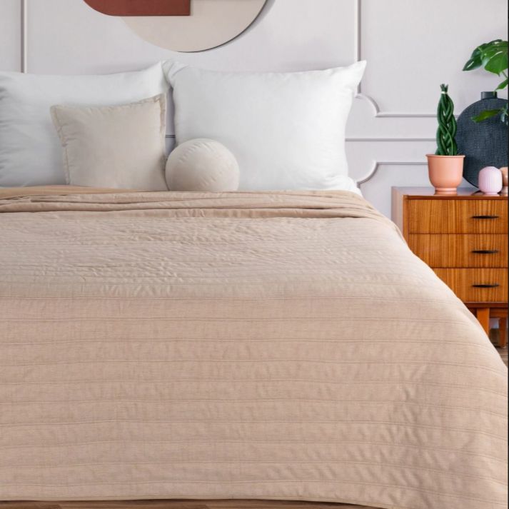 Dopřejte své ložnici teplou a útulnou atmosféru s elegantním meruňkovým přehozem s texturou lnu. Tento stylový prošívaný přehoz zaujme svým decentním designem a moderním vzhledem, který krásně doplní postel v ložnici nebo obývacím pokoji. Dekorativní horké prošívání v podobě jemných vodorovných linií vytváří zajímavou texturu a dodává přehozu elegantní charakter. Příjemná barva rozjasní interiér a vytvoří harmonický a relaxační prostor k odpočinku. Tento dekorativní přehoz je ideální pro ochranu ložního prádla, rychlé ustlaní postele a stylový doplněk moderního i klasického interiéru. elegantní prošívaný přehoz s texturou lnu moderní design s jemnými horizontálními liniemi příjemná meruňková barva pro útulnou atmosféru v ložnici ideální jako dekorativní přehoz na postel nebo pohovku lehký, praktický a snadno udržovatelný Specifikace: Barva: meruňková Materiál: 100% polyester Rozměrová tolerance: ± 5 % Pokyny k praní jsou uvedeny na štítku výrobku Cena za přehoz bez povlaků na polštáře Barva produktu se může mírně lišit v závislosti na nastavení monitoru