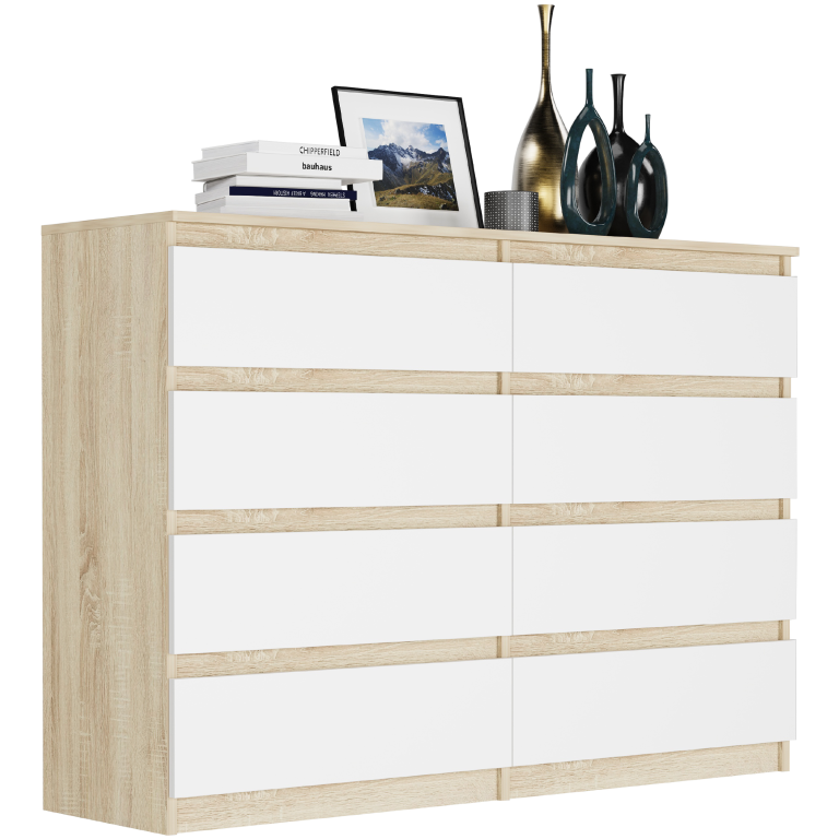 Moderní komoda R-140-S8 je ideální volbou pro ty, kteří hledají stylové, funkční a prostorově úsporné řešení interiéru. Díky svému jednoduchému, ale elegantnímu designu bez úchytek působí nadčasově a perfektně se hodí do moderních i klasických ložnic nebo obývacích pokojů. Prostorné zásuvky nabízejí praktický úložný prostor na oblečení, prádlo, dokumenty nebo drobné předměty, které potřebujete mít vždy po ruce. Komoda je vyrobena z vysoce kvalitní laminované desky, která zaručuje pevnost, odolnost a dlouhou životnost. Inovativní barevné designy dodávají nábytku příjemný vzhled a snadno se kombinují s ostatním zařízením. Specifikace: Barva: k dispozici různé barevné povrchové úpravy Materiál: laminovaná dřevotříska Výška: 98 cm Šířka: 140 cm Hloubka: 40 cm Styl: moderní, minimalistický Montáž: nábytek pro svépomocnou montáž