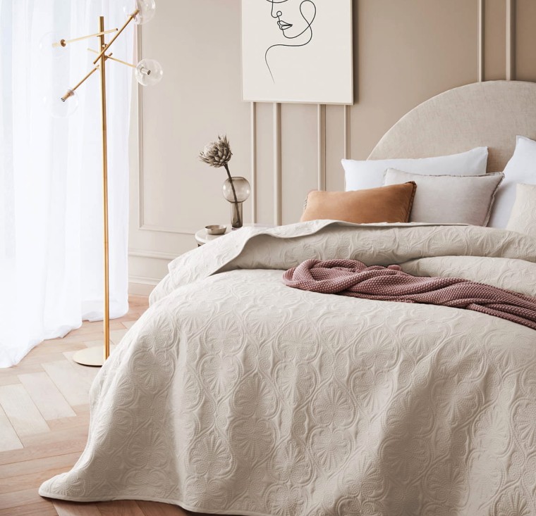 Přehoz Leila v krémové barvě. Estetika kolekce jemně překrývá styly, vyznačuje se nadčasovostí a vznešeným designem. Jemně prošívané detaily vytvářejí krásný, ornamentální vzor, který elegantně oživí monochromatický interiér. Hladká, matná látka přehozu, zdobená lemem, kombinuje harmonii a pohodlí a vytváří útulný prostor k relaxaci. Přehoz má obrovský aranžovací potenciál, obsahuje bohaté spektrum barev - od klidných barev s nádechem tepla až po syté výrazné tóny. Specifikace: 100% polyester . rozměr: 200 x 220 cm barva: krémová Certifikát Oeko-Tex 100 - certifikát bezpečnosti a kvality Prošívání zvyšuje pevnost výrobku Snadno se udržuje v čistotě Perfektní nápad na dárek Vyberte si povlaky na polštáře ze stejné kolekce a vytvořte si sadu Leila!
