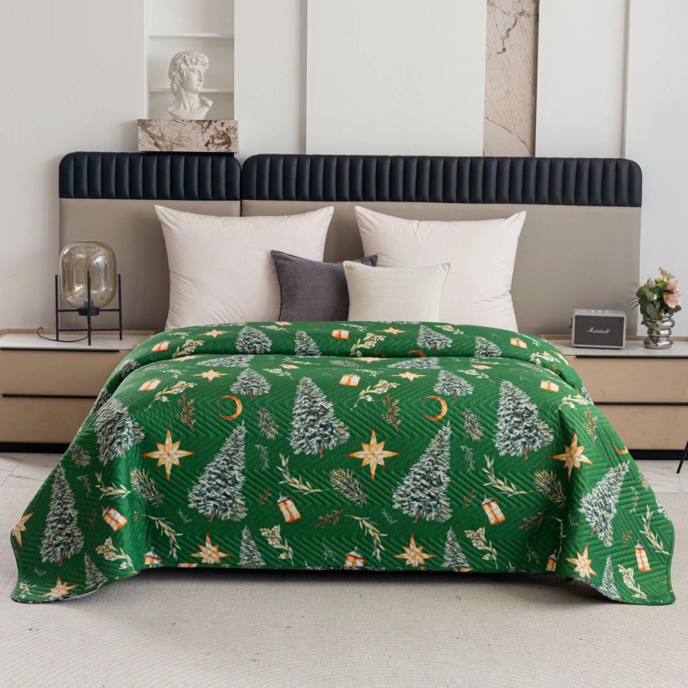 Vneste do své ložnice pravou vánoční atmosféru s tímto prošívaným vánočním přehozem. Vyroben z vysoce kvalitního 100% polyesteru, potěší svou měkkostí, odolností a snadnou údržbou. Sytá zelená barva v kombinaci s motivem zasněžených vánočních stromků, luceren a větviček vytváří harmonickou kompozici, která zútulní každý interiér. Díky prošívanému povrchu je přehoz pevný, elegantní a dlouho si zachovává svůj tvar. Je ideální pro použití v zimních měsících a zároveň krásně doplní vánoční výzdobu ložnice. Perfektní dárek pro každého, kdo miluje Vánoce a tradiční eleganci. Specifikace: Barva: zelená Velikost: dle vašeho výběru - v nabídce více velikostí Materiál: 100% polyester Rozměrová tolerance +/- 5 %. Cena zahrnuje: přehoz bez povlaků na polštáře Pokyny k praní naleznete na štítku Barvy se mohou mírně lišit v závislosti na nastavení monitoru