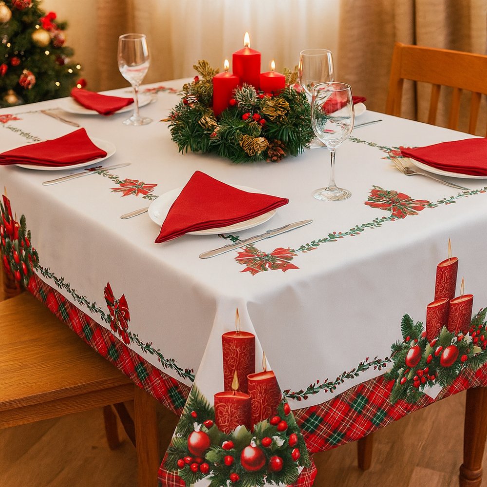 Dodá vašemu svátečnímu stolu tradiční vánoční kouzlo bílým ubrusem zdobeným výrazným červenozeleným kostkovaným okrajem a elegantním motivem sváteční svíčky. Uprostřed je krásná kompozice červených svíček obklopených smrkovými větvemi, bobulemi a ozdobami, která evokuje útulnou sváteční atmosféru. Červenozelený kostkovaný rám je doplněn jemnými detaily, díky nimž ubrus působí elegantně i radostně zároveň. Vysoce kvalitní polyesterový materiál je hladký, lehký a nenáročný na údržbu, takže ubrus nejen ozdobí váš stůl během Vánoc, ale zaručí i praktické využití při rodinných setkáních. V kombinaci s dalšími produkty ze stejné kolekce vytvoříte perfektní sváteční sadu do vaší jídelny nebo obývacího pokoje. Specifikace: Barva: bílo-zeleno-červená Materiál: 100% polyester Péče: pokyny na štítku Rozměrová tolerance : +/- 5% Velikost: více velikostí na výběr