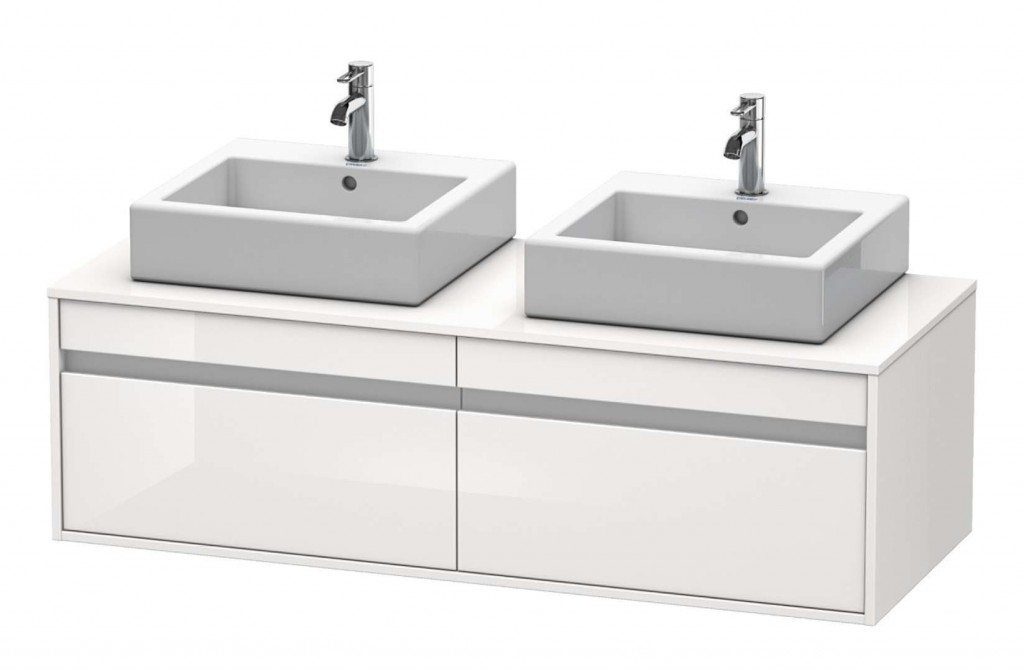 Závěsná skříňka pro 2 umyvadla na desku rozměry: 426 x 1400 x 550 mm materiál korpusu: vysoce kompaktní třívrstvá DTD, na obou stranách slisovaná s laminátem HPL, hrany ABS 2 x velká zásuvka barva: bílá vysoký lesk nosná horní deska se 2 výřezy pro instalaci umyvadla vlevo a vpravo materiál desky: vysoce kompaktní třívrstvá DTD, na obou stranách slisovaná s laminátem HPL, hrany ABS ergonomické úchytky pro otevírání instalace: zavěšením na stěnu, sifon šetřící místo není součástí balení Ilustrativní foto, umyvadla na desku nejsou součástí balení, je třeba objednat samostatně.