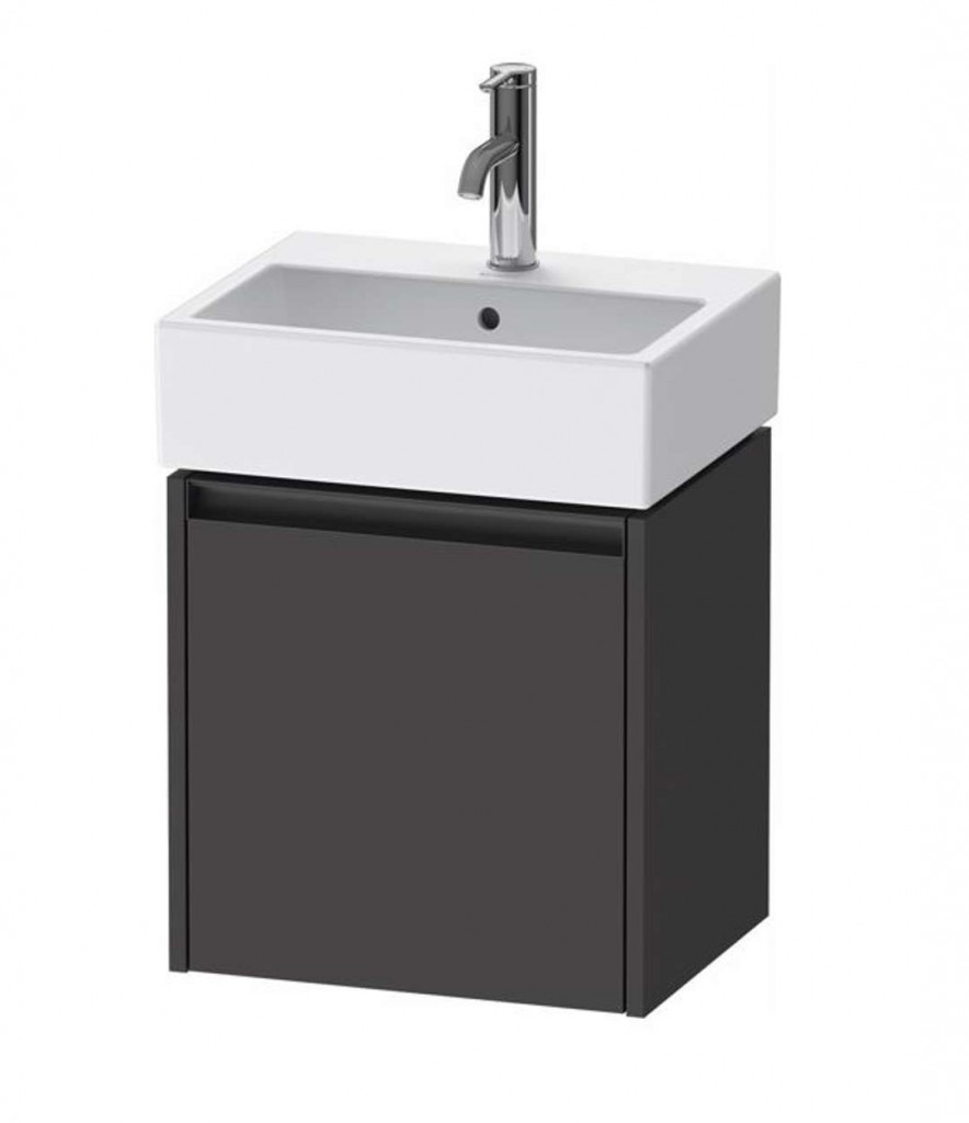Skříňka pod umyvadlo barva grafit matt rozměry 440 x 434 x 338 mm pro umyvadlo Vero Air materiál skříňky 3-vrstvá dřevotříska s vysokou hustotou materiál rukojeti hliník 1 dvířka, panty vlevo závěsná nástěnná instalace odstup od stěny minimálně 20 mm Umyvadlo ani baterie nejsou součástí balení.