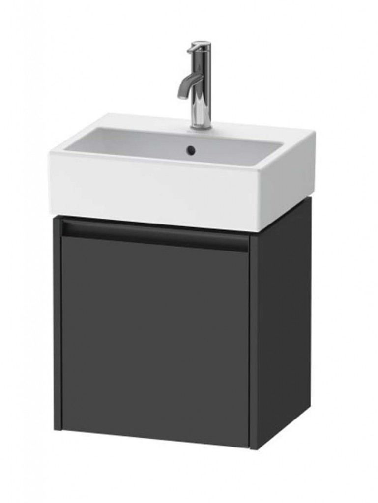 Skříňka pod umyvadlo barva grafit matt rozměry 440 x 434 x 338 mm pro umyvadlo Vero Air materiál skříňky 3-vrstvá dřevotříska s vysokou hustotou materiál rukojeti hliník 1 dvířka, panty vpravo závěsná nástěnná instalace odstup od stěny minimálně 20 mm Umyvadlo ani baterie nejsou součástí balení.