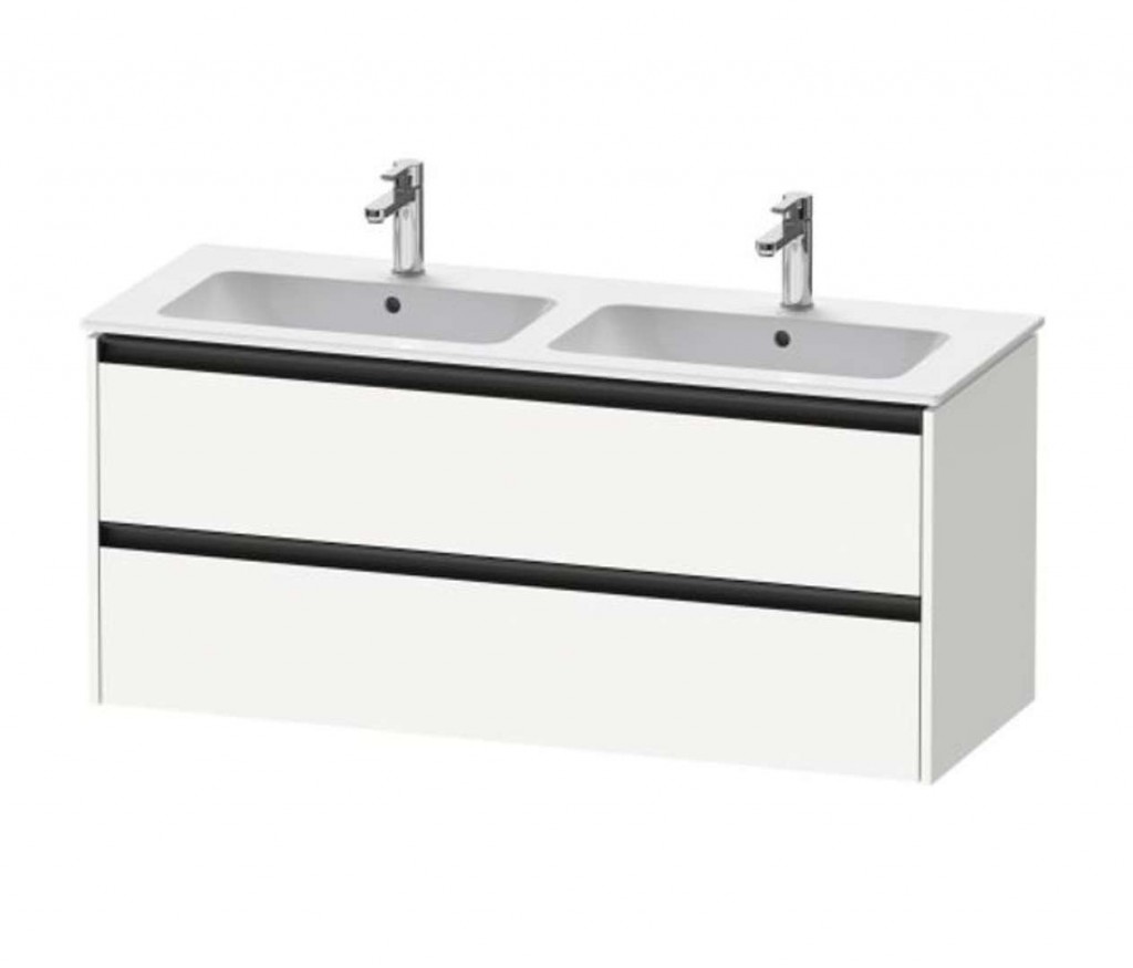 Skříňka pod dvojumyvadlo barva matná bílá rozměry 550 x 1280 x 480 mm vnitřní zásuvka s výřezem pro sifon pro umyvadla ME by Starck materiál skříňky 3-vrstvá dřevotříska s vysokou hustotou materiál rukojeti hliník 2 zásuvky závěsná nástěnná instalace Umyvadlo, baterie ani vnitřní vybavení nejsou součástí balení.