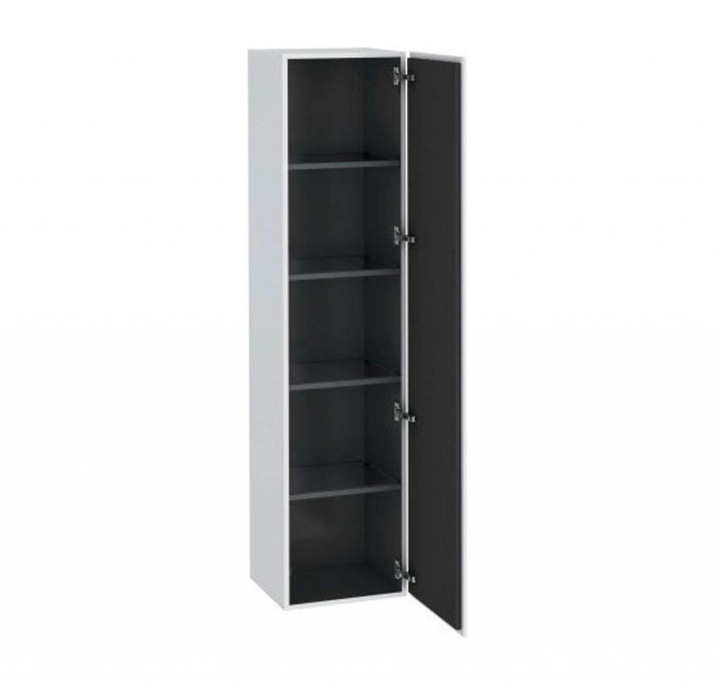 Vysoká skříňka vnější dekor: bílá mat vnitřní dekor: diamantově černá materiál: 3-vrstvá dřevotříska, melamin rozměr: 1760 x 400 x 363 mm panty vpravo, tlumené odolná proti vlhkosti 4 skleněné police s hliníkovým nosným systémem nástěnná instalace