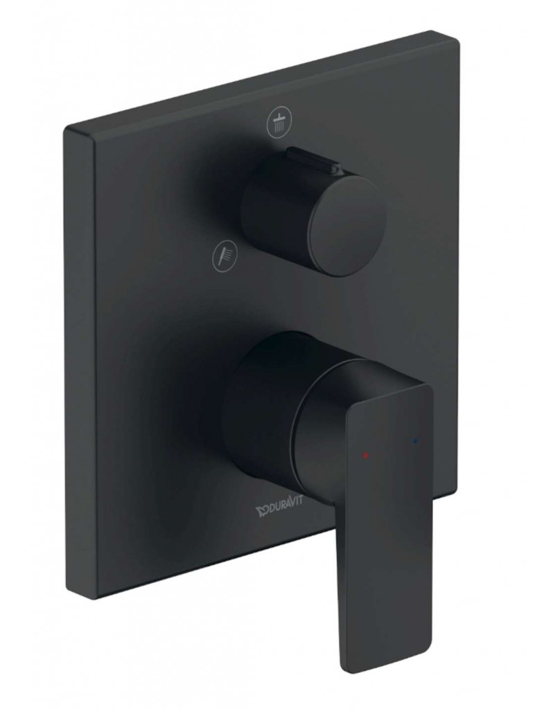Podomítková sprchová baterie barva matná černá pákové ovládání podomítková montáž keramická kartuše hranatá krycí rozeta, 150 x 150 mm pro 2 spotřebiče symboly pro ruční a hlavovou sprchu Instalace na montážní těleso, není součástí balení.