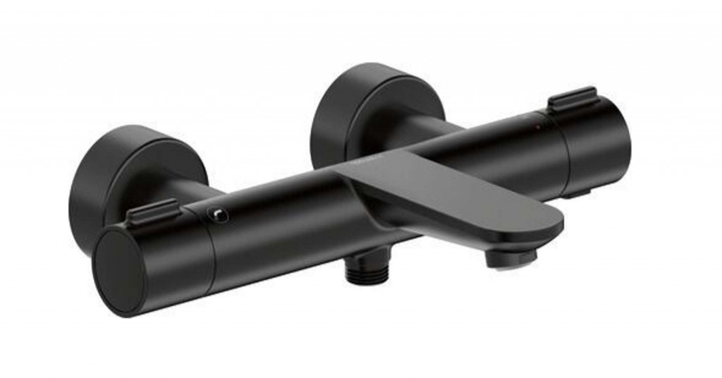 Vanová termostatická baterie barva matná černá nástěnná montáž šířka baterie 303 mm rozteč 150±15 mm termostatická kartuše bezpečnostní pojistka na 38 °C průtok 18 l/min při tlaku 3 bary uzavírací a přepínací ventil zpětná klapka na připojovací hadici S-přípojky připojení G 1/2"