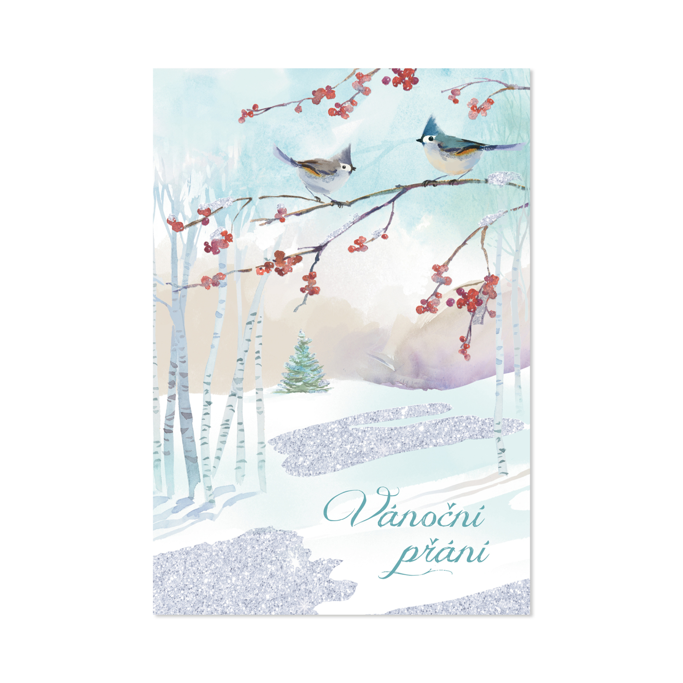 Vánoční přání s motivem zimní zasněžené krajiny se sýkorkami a třpytivým glitrem. Uvnitř přání najdete univerzální text. Text uvnitř přání: Příjemně prožité vánoční svátky, pohodové chvíle s vašimi blízkými a do nového roku spoustu štěstí, pevné zdraví a hodně úspěchů přeje... Součástí balení je i bílá obálka. Rozměry: 13,5 × 19,5 cm