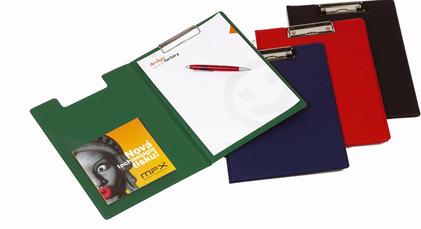 Uzavíratelná psací podložka s kovovým klipem, vyrobena z extra pevné lepenky. Vnitřní průhledná kapsa