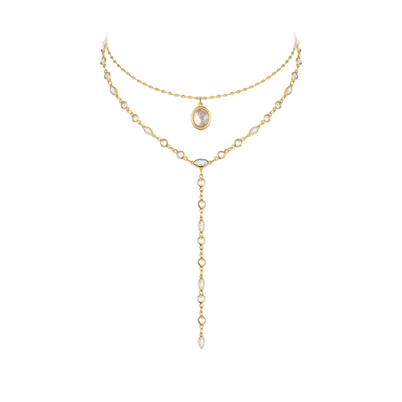 Spojili jsme dva elegantní náhrdelníky do jednoho výjimečného celku, který působí dokonale sladěně. Kratší řetízek s jemným oválným přívěskem vytváří kontrast k delší vrstvě s drobnými zirkony – dohromady tvoří harmonickou kompozici plnou světla, ženskosti a noblesy.Každý detail je promyšlený do posledního článku. Zlacený povrch podtrhuje luxusní charakter šperku, zatímco zirkony dodávají třpyt, který rozzáří dekolt i celý outfit. Díky promyšlené konstrukci lze jednotlivé vrstvy nosit společně nebo samostatně, podle nálady i příležitosti.Tento univerzální šperk působí jemně, ale přitom nezaměnitelně. Skvěle doplní elegantní šaty, hedvábnou halenku i minimalistické topy – vždy přidá kapku ženského kouzla a dokonalé ladnosti. 💡 Tip: Vrstvěte obě části dohromady pro plný efekt. Dvojitý náhrdelník vynikne zejména k výstřihu do V nebo k jednoduchým šatům, kde se může naplno projevit jeho zářivý charakter.