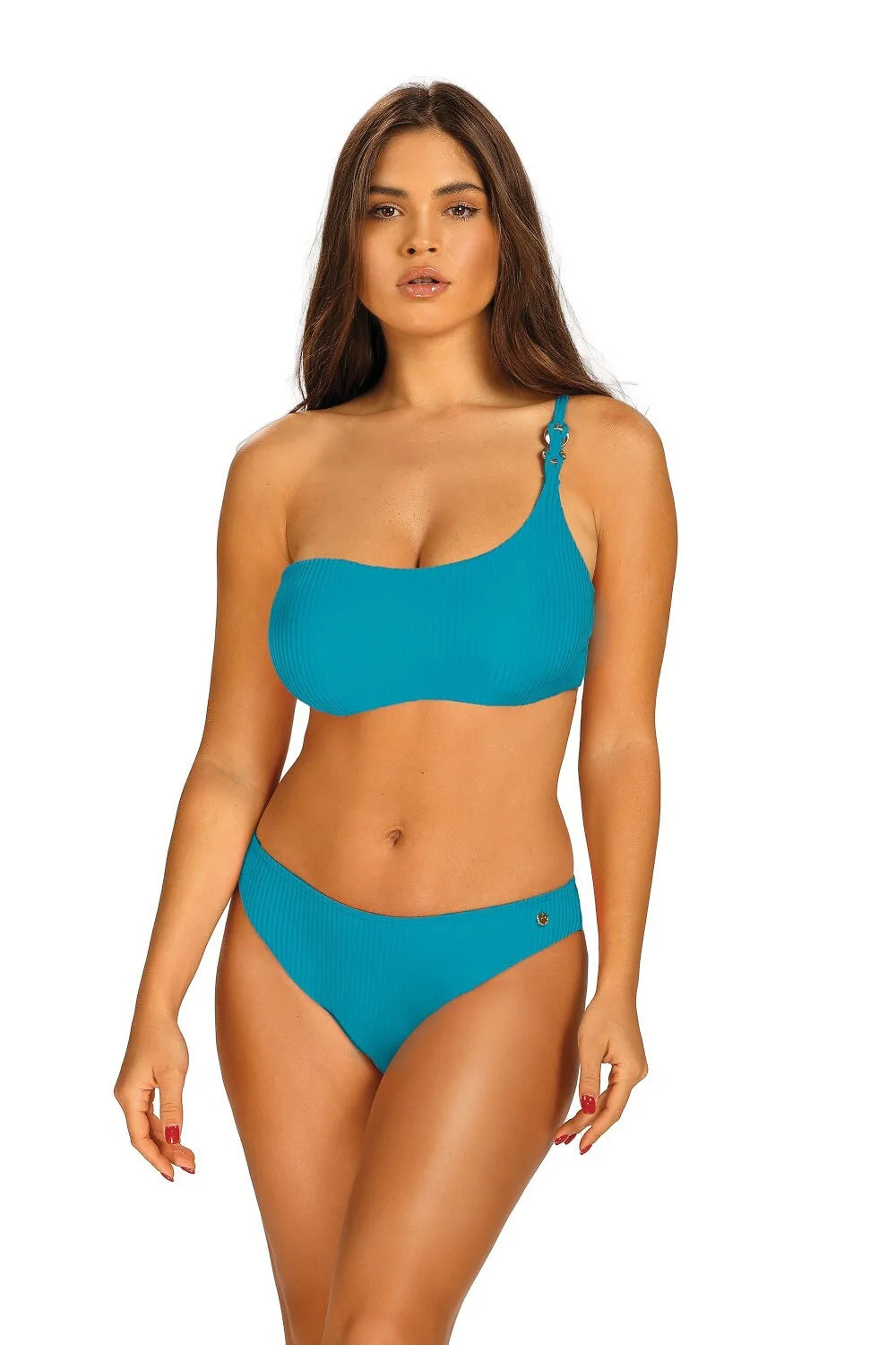 Dvoudílné plavky - podprsenka s kosticemi - šálky s tenkými odnímatelnými houbičkami - přes jedno rameno - jemně žebrovaný úplet - kalhotky klasického střihu Složení: 78 % polyamid, 22 % elastan