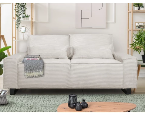 Moderní dvoumístná pohovka očalouněna měkkoučkou strukturovanou látkou v barvě krémová. Pohodlné sezení doplňují velké komfortní polštáře a bederní polštářky.