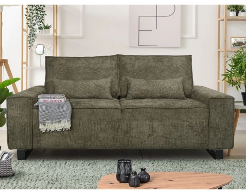 Moderní dvoumístná pohovka očalouněna sametově hebkou tkaninou v barvě olivově zelená. Pohodlné sezení doplňují velké komfortní polštáře a bederní polštářky.