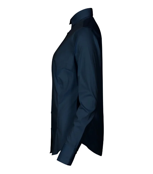 jemný strečový materiál projmutý střih s bočními švy dvojité sedlo na zadním dílu pasové a prsní záševky dvoudílný košilový límec přední kraje začištěny légou dlouhé rukávy s šikmou manžetou na 2 knoflíčky perleťové knoflíčky v barvě materiálu (1 náhradní navíc) tvarovaný dolní kraj
