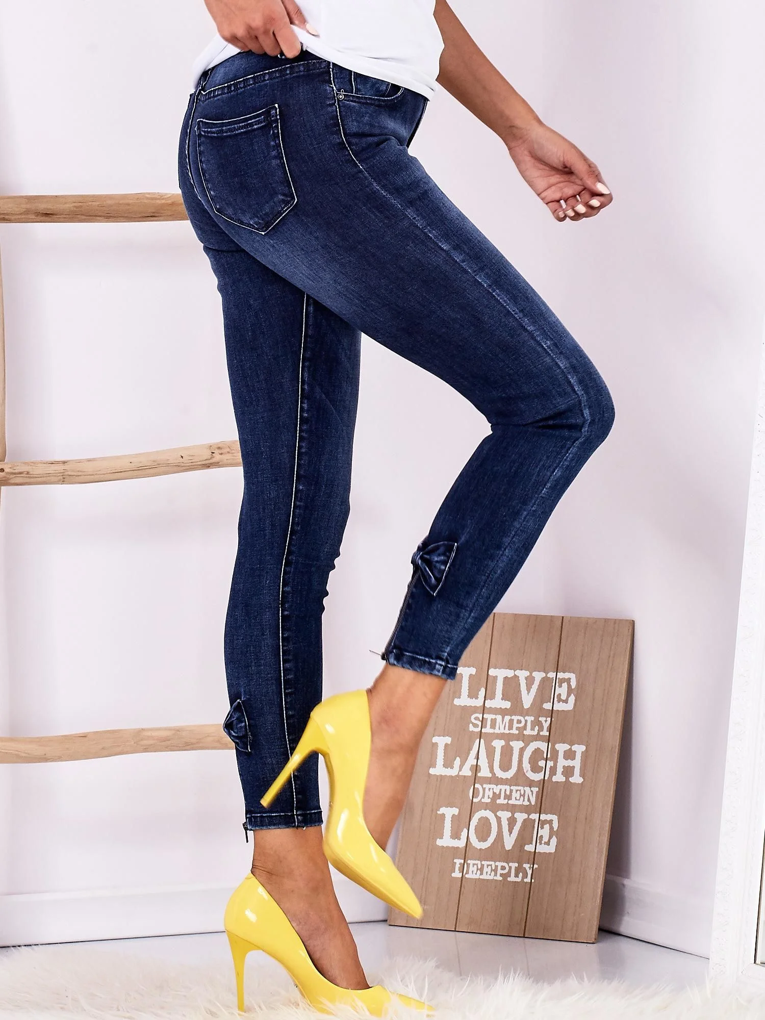 Tmavě modré kalhoty s vysokým pasem a mašlemi složení materiálu: 85 % bavlna, 13 % polyester, 2 % elastan způsob praní: praní v pračce na 30 °C Modelka má na sobě velikost 36. Míry modelky: výška 175 cm, prsa 84 cm, pas 65 cm, boky 92 cm.