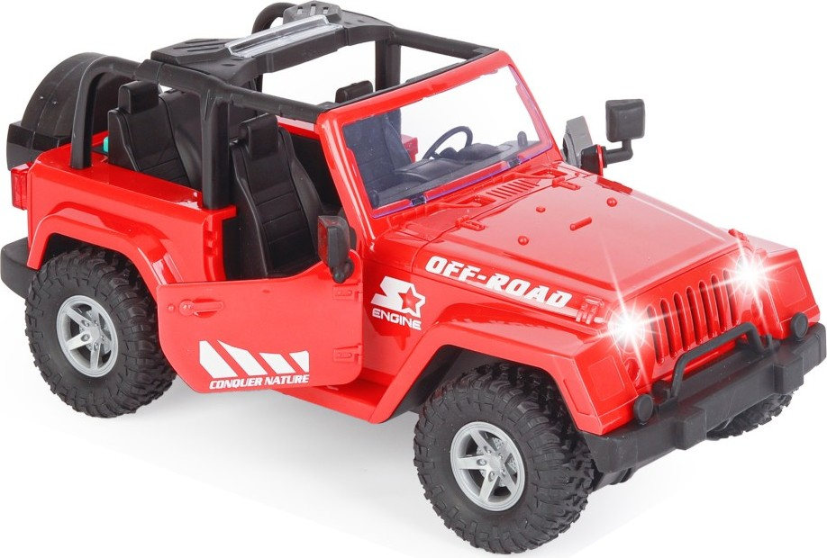 Džíp v měřítku 1:10 představuje detailně propracovaný model terénního vozidla, který je k dispozici ve třech barevných variantách – červené, žluté a khaki zelené. Vozidlo je navrženo s důrazem na realismus, což dokládají otevírací dveře, robustní konstrukce a výrazné terénní pneumatiky, které podtrhují jeho off-road charakter. Interiér džípu je černý a detailně zpracovaný, doplněný o volant a sedadla, což přispívá k celkovému dojmu skutečného terénního auta. Tento model je vybaven světelnými a zvukovými efekty, které výrazně zvyšují zážitek z hraní. Přední světlomety při zapnutí svítí a doprovázejí je realistické zvuky motoru i dalších zvukových efektů, to přináší do hry ještě více akce a zábavy. Napájení zajišťují tři baterie typu AA, které nejsou součástí balení, a díky nim jsou všechny efekty plně funkční. Džíp je dodáván v dobře viditelném a barevném obalu, který obsahuje průhledné okénko umožňující zhlédnutí modelu přímo v krabici. Obal zdůrazňuje hlavní přednosti vozidla, jako jsou světelné a zvukové efekty, a také zmínku o třech dostupných barvách. Hračka je určena dětem od 3 let, ale díky svému vzhledu a kvalitě zpracování je vhodná i pro sběratele mini autíček. Celkově je tento džíp ideální volbou pro malé dobrodruhy, kteří chtějí zažít vzrušení z jízdy v terénu, ale také pro všechny, kdo ocení realistický model s atraktivními doplňky. Kombinace robustního designu, interaktivních prvků a různých barevných variant nabízí široké možnosti zábavy i sbírání.
