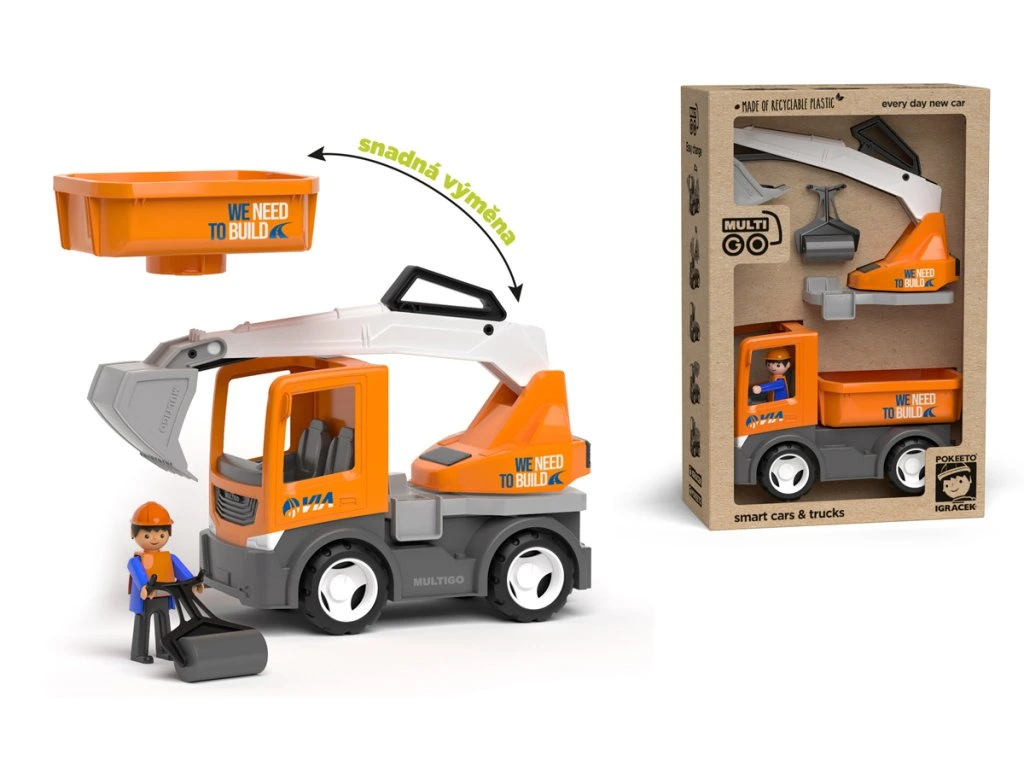 MultiGO funkční set s jedinečným stavebnicovým systémem výměny nástaveb a Igráčkem Silničářem. Rozvíjí jemnou motoriku. Pro děti od 3 let. Eco-friendly balení s FSC® certifikací, 100% recyklovatelný plast, nadstandardní životnost. Vyrobeno v ČR.
