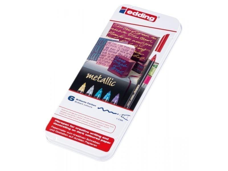 Fixy EDDING 1200, sada 6 ks, metalové barvy v kovové krabičce. Pero s kulatým hrotem pro ozdobné písmo a menší kresby. Inkoust s metalicky lesklým efektem vyniká zejména na tmavém papíru. Po nanesení jsou barvy zářivé a dobře kryjí. Náplň ozdobného fixu, jak bych se toto pero dalo označit, je založena na bázi vody. Je rychleschnoucí a má neutrální vůni. Hrot má šířku 1-3 mm.