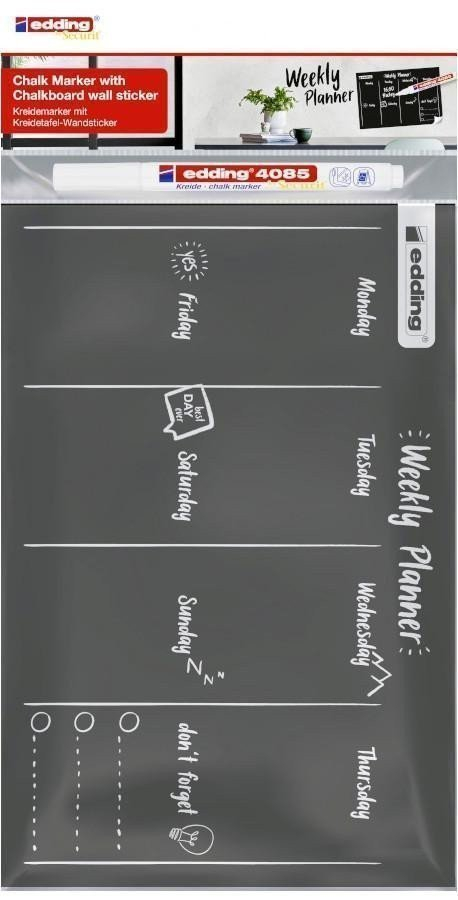 Sada bílého křídového popisovače edding 4085 a týdenního plánovače. Křídový popisovač edding 4085 je nepermanentní fix ve formě tekuté křídy. Tenký hrot nabízí čistou precizní stopu. Inkoust na bázi vody vyniká vysokou krycí schopností, proto je napsaná stopa velmi dobře vidět. Křídový popisovač lze využít k psaní na okna, skla, plexiskla, zrcadla a tmavé tabule. Inkoust se dá smýt ze všech neporézních materiálů vlhkým hadříkem. Tekutá křída edding je oblíbená v hotelích, restauracích, barech a zároveň ve sklářském průmyslu. Využívá se také ke zdobení a popisování oken v domácnostech a v kancelářích. Tok inkoustu je řízen ventilem, a proto je před prvním použitím potřeba popisovač protřepat, sejmout víčko a lehkým pumpováním umožnit inkoustu stéci do hrotu. Skladujte ve vodorovné poloze. Kulatý hrot. Šíře stopy: 1-2 mm. Týdenní plánovač v podobě černé samolepicí fólie je snadno snímatelný i přemístitelný. Rozvrh je možné popisovat křídovými fixami, které jsou smývatelné vlhkým hadrem. Plánovač lze nalepit na všechny hladké povrchy. Rozměry: 30 x 20 cm.
