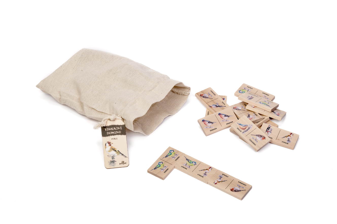 Domino vyrábí u nás v dílně české ruce z kvalitního českého certifikovaného dřeva. Balení obsahuje 28 dílků o velikosti 8 × 4 × 0,7 cm. Zabaleno v přírodním látkovém pytlíku. Autorem kreseb jsou čeští ilustrátoři, obrázky jsou chráněny autorskými právy. Domino zábavnou a hravou formou seznamuje děti i dospělé s přírodou. Druhy ptáků: pěnkava, stehlík, brhlík, sojka, červenka, sýkora, strakapoud. Lesní svět = značka s ekologickým certifikátem udržitelného hospodářství PEFC. Všechny výrobky jsou vyrobeny s ohledem na životní prostředí.