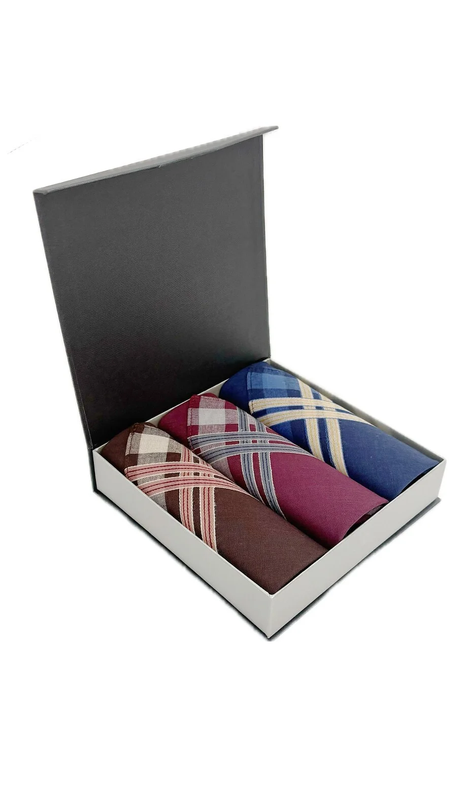 Pánské kapesníky - z jemně tkané bavlny - lemované úzkým plochým švem - baleno po 3 kusech v elegantní krabičce - velikost 40x40 cm - balené v různých barevných sadách Složení: 100% bavlna