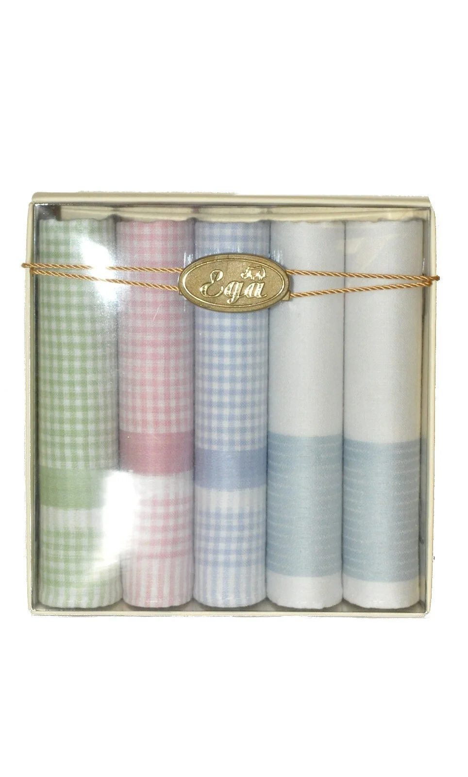 Dámské kapesníky - z jemně tkané bavlny - lemované úzkým plochým švem - balené po pěti kusech v elegantní krabičce - různé barevné kombinace - velikost 30x30 cm Složení: 100% bavlna