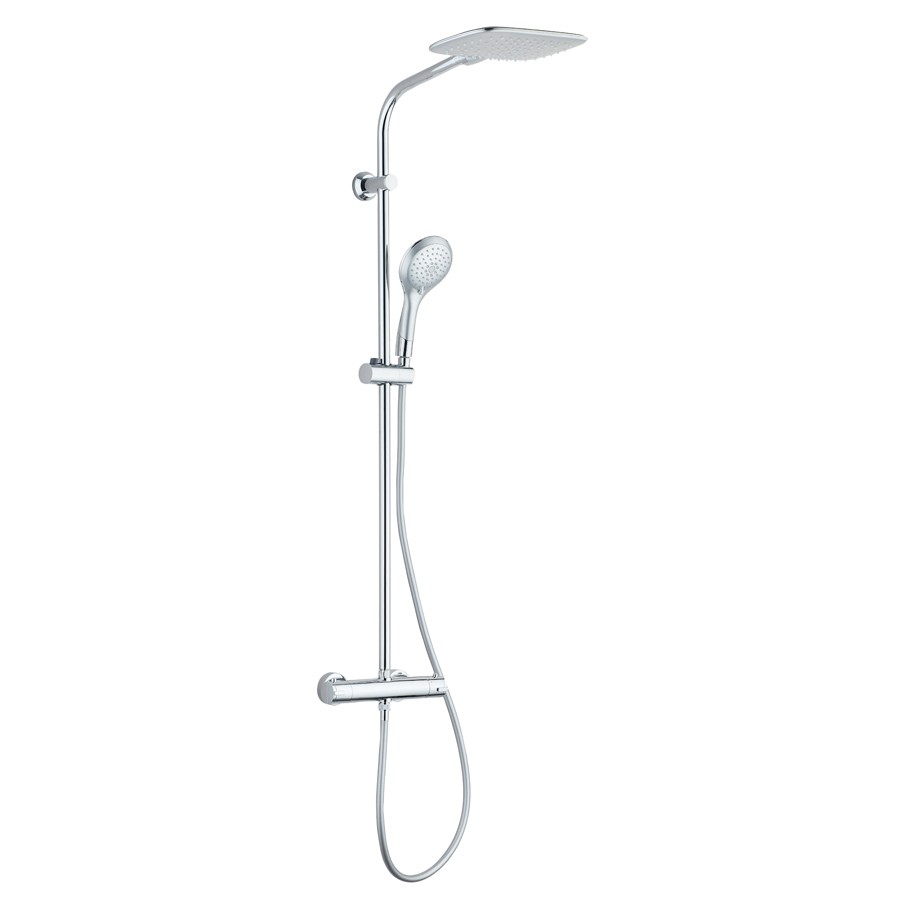 Sprchový sloup s termostatickou baterií Specifikace: Sprchový set obsahuje kovovou sprchovou tyč, horní sprchu, sprchovou hadici a ruční sprchu (sprchová růžice) a termostatickou baterii Na ruční i stropní sprše jsou nopky proti usazování vodního kamene Praktické vybavení sprchového koutu ve vaší koupelně pro příjemný zážitek ze sprchování Ochrana proti opaření- termostat je chráněn blokovací funkcí (bezpečnostní pojistka při 38°C) Těsnění na spoření vody, až 50% úspora Povrchová úprava chrom Popis: Kvalitní sprchový sloup v masivním kovovém provedení s povrchovou úpravou chrom ve vysokém lesku Snadné čištění pomocí výstupků proti usazování vodního kamene Extra velká hlavová sprcha 26 x 23 cm Ruční sprcha se 3 funkcemi- inovativní tlačítková technologie pro nastavení trysek (cca 7,4 x 23 cm) Sprchová hadice délka 150 cm Kovová sprchová tyč, délka: cca 105 cm Kovová připojovací hadice o délce 60cm