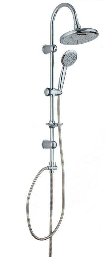 Sprchový set , obsahuje sprchovou baterii, ruční sprchu a horní sprchu. Výška setu je 102 cm, vzdálenost výtoku horní sprchy od zdi je 245 mm. Kovové tělo s povrchovou úpravou chrom Hlavová sprcha průměru 21 cm Hadice ke sprše délka 1,5 m Přepínací ventil mezi horní sprchou a ruční sprchou. 7-polohová ruční sprcha Držák ruční sprchy polohovatelný Odkládací polička. Variabilní upevnění držáků na zeď, plynule lze nastavit rozteč až do vzdálenosti 75cm Čistě válcovité linie Nástěnná páková sprchová baterie Rozteč přívodů vody je 100 mm Kartuše 35 mm Sprchová baterie má zajištěný servis do domu