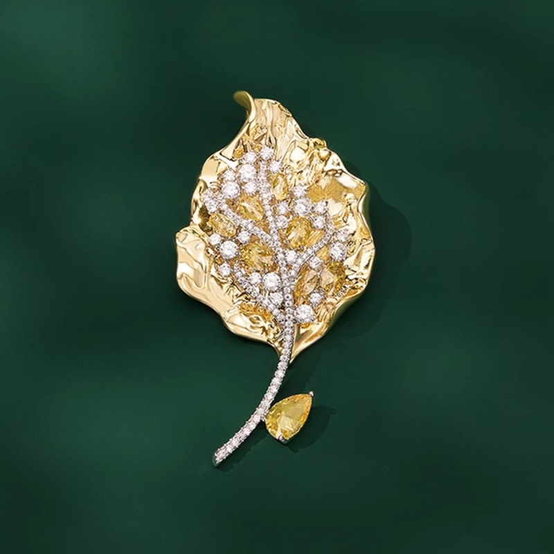 Tato luxusní brož ve tvaru listu je oslavou elegance a výjimečného designu. Dominantním prvkem je bohatě zdobený list ve zlatém tónu, který připomíná podzimní přírodní krásu. Středová linie listu je tvořena třpytivými zirkony a žlutými krystaly, jež vytvářejí iluzi žilkování a dodávají celému šperku hloubku a lesk.Rafinovaná kombinace žlutých odstínů a lesklých detailů vytváří efekt sluneční záře a vnáší do outfitu optimismus a světlo. Její výrazný tvar je zároveň jemný a sofistikovaný – ideální pro ženy, které touží po originálním a vkusném doplňku. Precizní provedení a luxusní vzhled činí tuto brož výjimečnou volbou pro slavnostní příležitosti.Ať už ji připnete na sako, kabát nebo šaty, brož ve tvaru listu bude nepřehlédnutelným akcentem. Skvěle vynikne samostatně i jako součást větší kolekce. Tento šperk je ideálním způsobem, jak vyjádřit osobitý styl a eleganci s přírodním motivem. 💡Tip: Připněte brož na černé sako nebo jedinečné večerní šaty, kde její zářivý vzhled nejlépe vynikne. Výborně se hodí i jako detail na klobouku nebo šále.