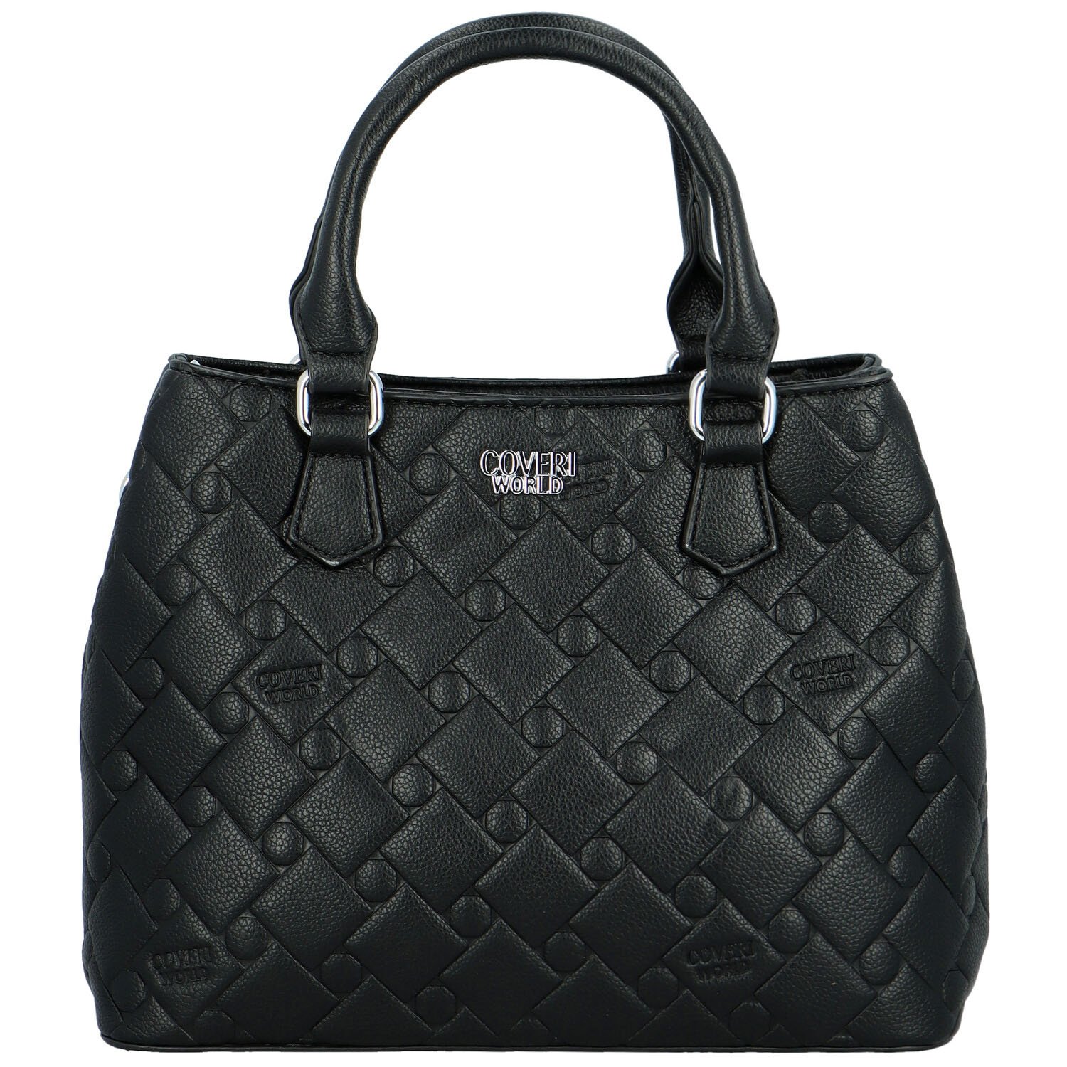 Jemné prošití v podobě geometrických tvarů, které vytváří jemný a moderní design. Na přední straně je stříbrné logo značky i vyražené nápisy v kožence. Kabelka má dvě pevná ucha připevněná kovovými přezkami stříbrné barvy.