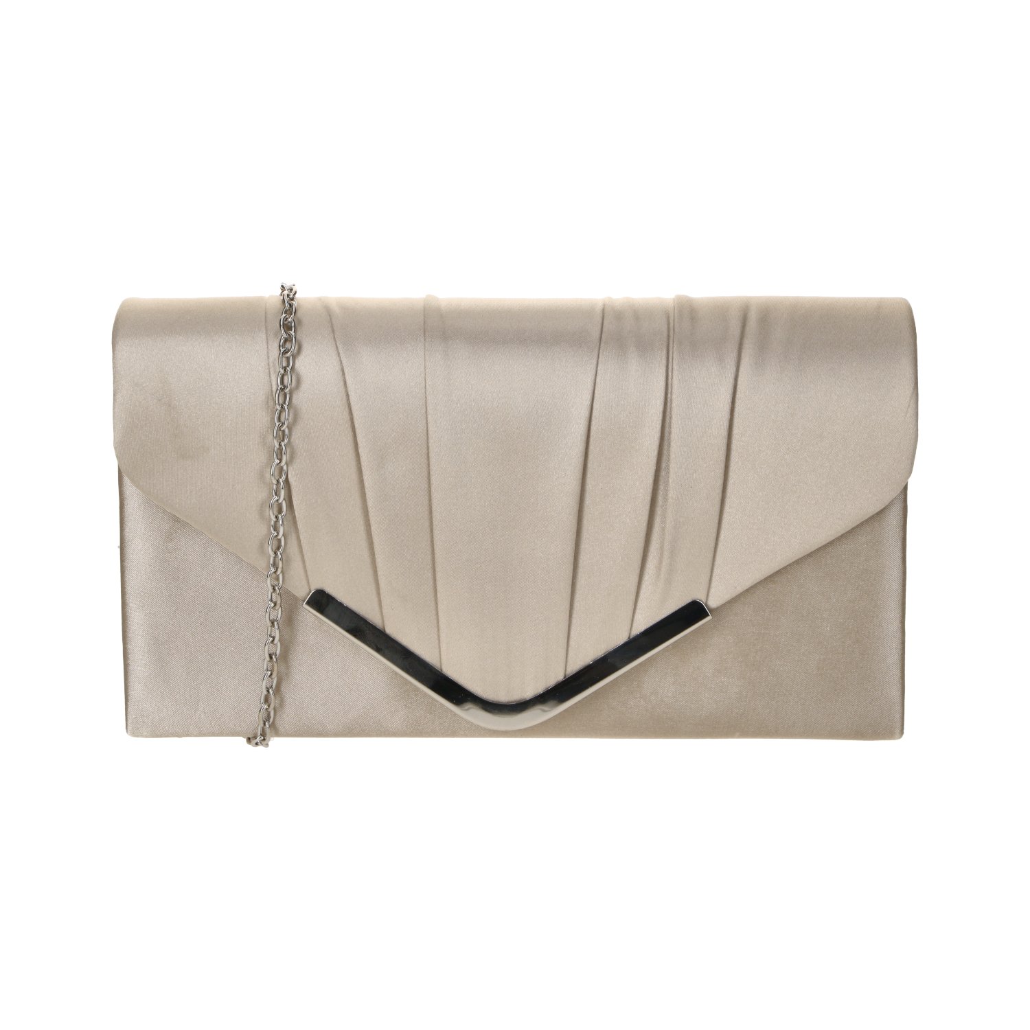 Elegantní společenská kabelka je perfektním doplňkem pro slavnostní příležitosti. Díky luxusnímu saténovému vzhledu a stylovému řasení na přední klopě působí velmi sofistikovaně a ženskě. Moderní kovový detail ve tvaru písmene V dodává kabelce jedinečný a výrazný charakter.
