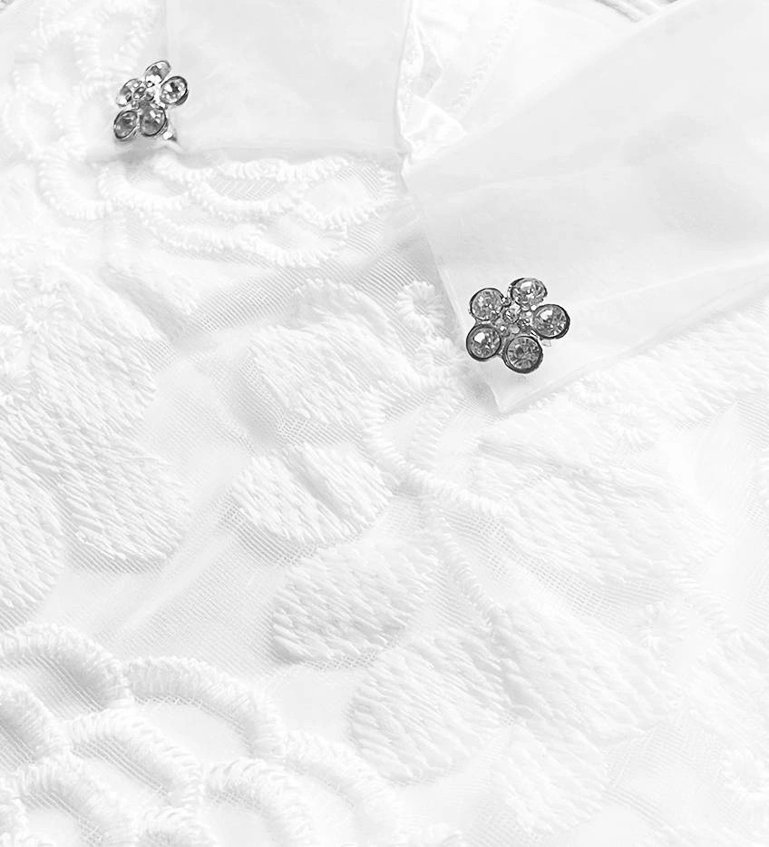 Věnujte prosím pozornost při výběru velikosti dle velikostní tabulky uvedené níže. Velikosti neodpovídají běžně nošené konfekci. Elegantní halenka s límečkem Halenka má volný střih a ve přední části je vyšívaná. Pod vyšívanou vrstvou je podšívka. Límeček se vzadu zapíná knoflíčkem. Halenka je doplněná dvěma brožemi, kterými je možné ozdobit límeček. Složení: 95 % polyester, 5 % elastan. Velikost Šířka v ramenou Šířka v podpaží (x2) Šířka na spodním okraji (x2) Délka měřená od ramene Délka měřená od podpaží Délka rukávu měřená od ramene Délka rukávu měřená od podpaží Šířka rukávu v rameni S (36) 38 43 45 58 39 60 46 20 M (38) 39 45 47 59 40 60 46 21 L (40) 39 47 49 60 40 60 46 22