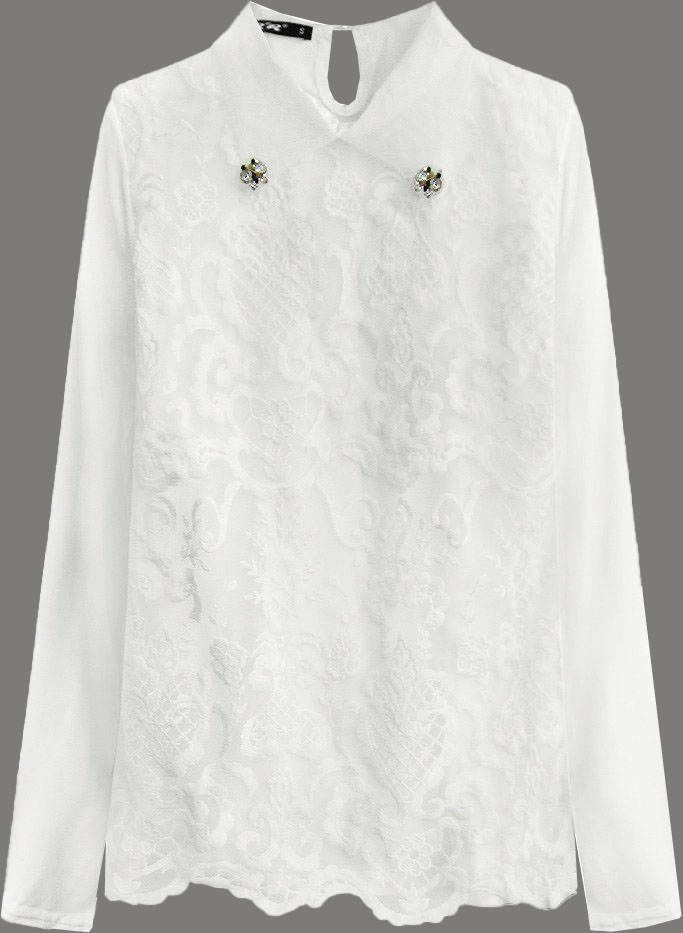 Věnujte prosím pozornost při výběru velikosti dle velikostní tabulky uvedené níže. Velikosti neodpovídají běžně nošené konfekci. Elegantní halenka s límečkem Halenka má volný střih a ve přední části je vyšívaná. Pod vyšívanou vrstvou je podšívka. Límeček se vzadu zapíná knoflíčkem. Halenka je doplněná dvěma brožemi, kterými je možné ozdobit límeček. Složení: 95 % polyester, 5 % elastan. Velikost Šířka v ramenou Šířka v podpaží (x2) Šířka na spodním okraji (x2) Délka měřená od ramene Délka měřená od podpaží Délka rukávu měřená od ramene Délka rukávu měřená od podpaží Šířka rukávu v rameni S (36) 36 42 44 58 38 58 44 20 M (38) 36 44 45 58 39 58 45 20 L (40) 37 45 46 59 40 58 46 20