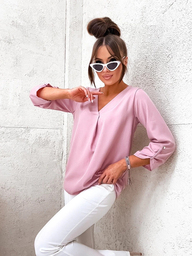 Věnujte prosím pozornost při výběru velikosti dle velikostní tabulky uvedené níže. Velikosti neodpovídají běžně nošené konfekci. Halenka s 3/4 rukávy Halenka má jednoduchý střih a výstřih ve tvaru písmene "V". Rukávy jsou shrnuté a podepnuté. Model má délku k bokům. Halenka je polským výrobkem. Složení: 65 % polyester, 30 % viskóza, 5 % elastan.
